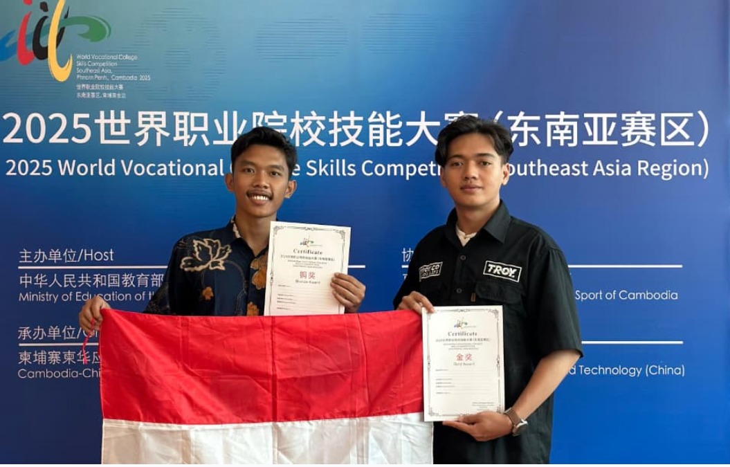January 8, 2026Phnom Penh, Kamboja – Mahasiswa Program Studi D-III Teknik Pemeliharaan Mesin Politeknik Manufaktur Bandung (Polman Bandung) kembali menorehkan prestasi di tingkat internasional. Dua mahasiswa Polman Bandung berhasil meraih juara dalam ajang World Vocational College Skills Competition (Southeast Asia Regional Competition) yang diselenggarakan di Phnom Penh, Kamboja.