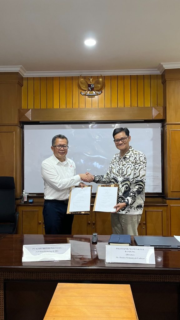 February 6, 2026Bandung — Politeknik Manufaktur Bandung (Polman Bandung) terus memperkuat perannya dalam menyiapkan sumber daya manusia (SDM) vokasi yang unggul dan relevan dengan kebutuhan industri masa depan. Komitmen tersebut diwujudkan melalui penandatanganan Nota Kesepahaman (Memorandum of Understanding/MoU) antara Polman Bandung, PT SGMW Motor Indonesia, dan Liuzhou Polytechnic University (LZPU), China, dalam rangka pengembangan pendidikan vokasi (Technical and Vocational Education and Training/TVET) di bidang New Energy Vehicle (NEV).