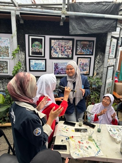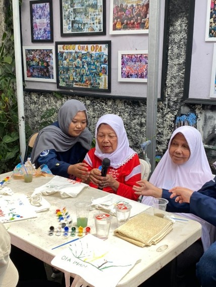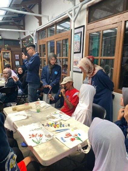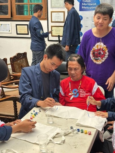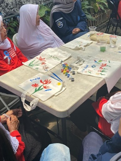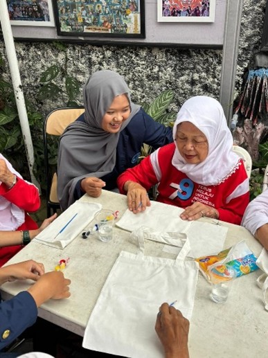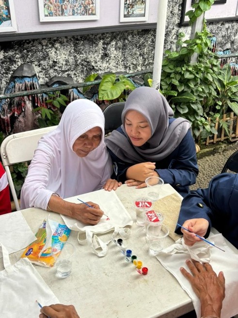 Sementara dalam aktivitas totebag art, para lansia diajak untuk melukis tas kanvas sesuai kreativitas masing-masing. Banyak hasil karya yang dibuat dengan penuh warna dan makna, dibantu oleh volunteer yang sabar menemani. Kegiatan ini juga diselingi dengan bernyanyi Bersama dengan para lansia, yang di mana ketika lagu diputar semangat dan antusias dari para lansia kembali bersinar.