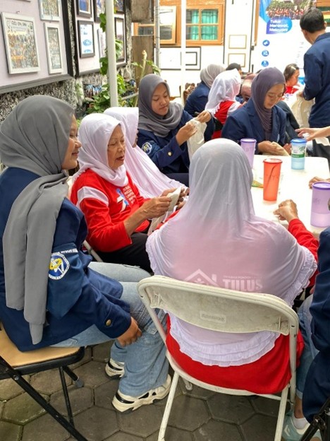 Kegiatan berlanjut dengan dua jenis permainan, yaitu pyramid cup dan totebag art. Pada permainan pyramid cup, para lansia didampingi volunteer menyusun gelas plastik secara bertingkat. meski tampak sederhana, permainan ini menghadirkan tawa, semangat kompetisi, serta kerja sama yang membuat suasana semakin meriah.